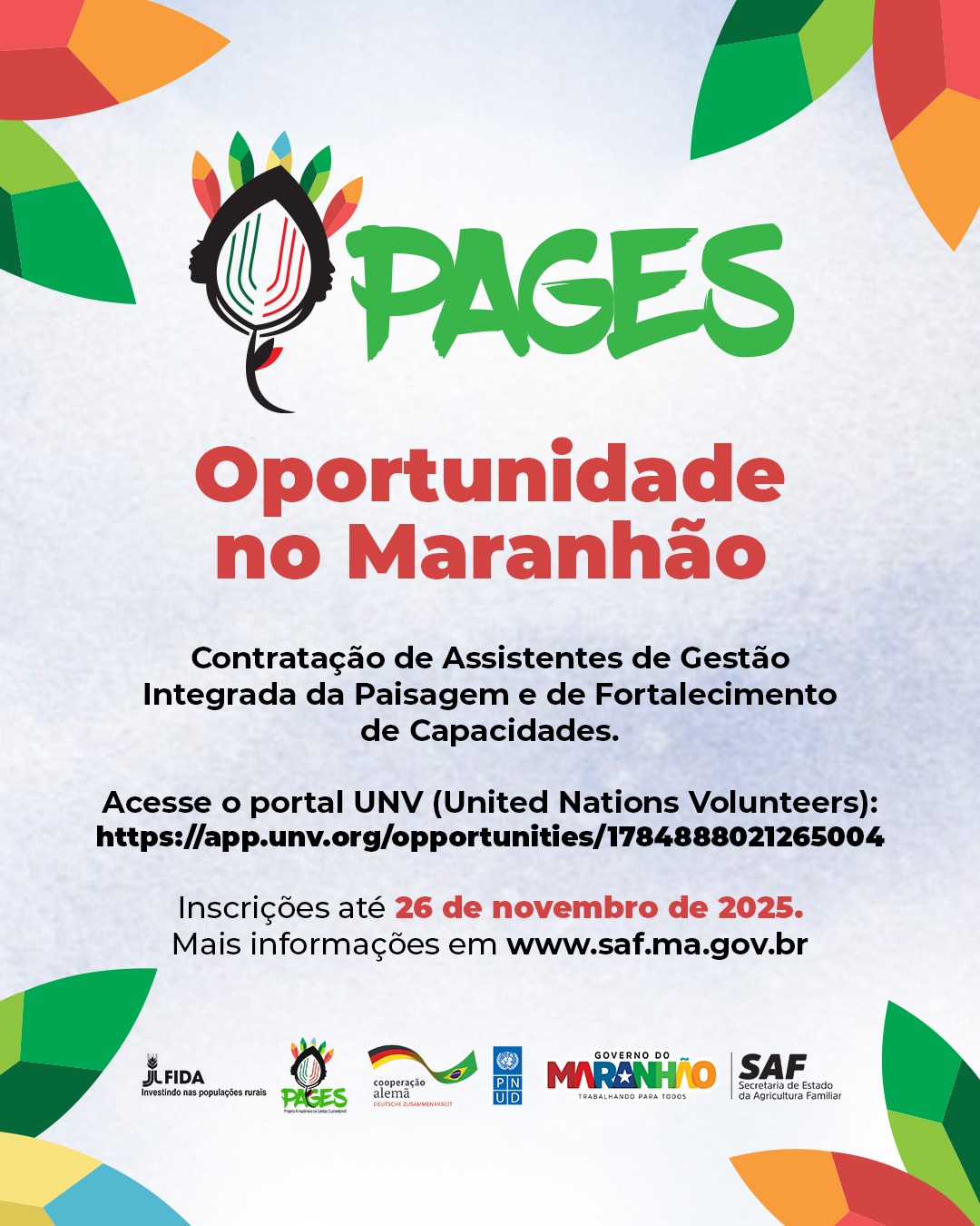 A Secretaria de Estado da Agricultura Familiar (SAF) e o Fundo Internacional de Desenvolvimento Agrícola (FIDA) abriram duas vagas para atuação no Projeto Amazônico de Gestão Sustentável (PAGES), por meio do programa Voluntários das Nações Unidas (UNV – United Nations Volunteers). As oportunidades são para os cargos de Assistente de Gestão da Paisagem Integrada e Assistente de Fortalecimento de Capacidades, com atuação presencial em São Luís (MA). As inscrições podem ser realizadas até 26 de novembro, diretamente no portal UNV: [url=https://app.unv.org/opportunities/1784888021265004]https://app.unv.org/opportunities/1784888021265004[/url].