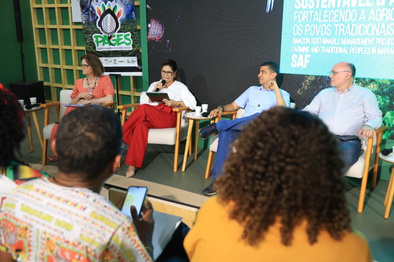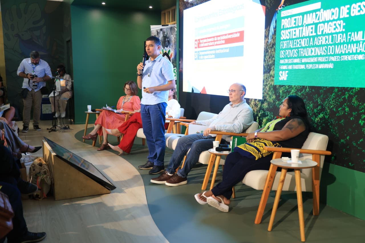 Durante o evento, a SAF conduziu o painel “Projeto Amazônico de Gestão Sustentável (PAGES): fortalecendo a agricultura familiar e os povos tradicionais do Maranhão”, que contou com a participação do secretário da SAF, Bira do Pindaré, da coordenadora-geral do projeto, Mariana Nóbrega, além de representantes do PNUD, Universidade Estadual do Maranhão (UEMA) e Secretaria de Estado dos Direitos Humanos e Participação Popular (SEDIHPOP).